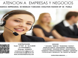 Somos uma agência de negócios publicitários modelos e recepcionistas avançadas e inovadoras, nascidas na cidade de Puebla dedicada à promoção, incentivando o lançamento de sua empresa ou produto ou serviço. a necessidade de uma relação mais estreita entre a comunicação de geração dois e contato visual preencher uma necessidade entre o cliente eo produto ou serviço, tendo em conta tanto as necessidades, ligando promoção diferente significa permitir o acesso ao cliente para que ele alcançar um objetivo inicial. sem gerar custos excessivos. Promotores Modelos Recepcionistas serviços formadores de opinião Volanteras assessores democratas (I) Segurança Privada equipamentos Karpas visual. elegante. Com arranjo do carro luz ônibus e vans com motorista serviço de estacionamento com manobrista para Taquiza Peritônio móvel Se necessário eventos.